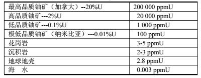 鈾在土壤、巖石及河流、海洋都可發現;甚至在人體和食品中都有痕跡量存在。但是濃縮的鈾礦卻只在很少的地方發現,一般是在堅硬的巖石中,如在地殼中占60%的花崗巖中,其鈾含量可達百萬分之四。