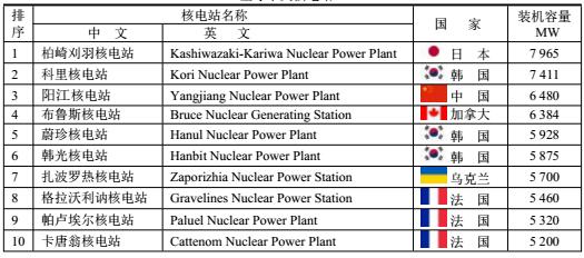 世界上最大的核電站是日本柏崎刈羽核電站,裝機容量為7965MW,但2011年已經停工。值得注意的是韓國核電站進展很快,前十位核電站就占有4席,把美國和日本都摔到后面。