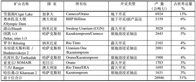 2018年世界十大鈾礦占據了全球總產量的51%。雖然加拿大雪茄湖居產量之首,但哈薩克斯坦占了4席。