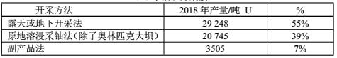 采礦方法一直在改變。1990年世界55%的產量來自地下礦山,但到1999年,這一比例急劇下降,當時為33%。從2000年起,加拿大的新礦山又增加了產量。原地溶浸采鈾法(ISL或ISR)采礦在總產量中的份額一直在穩步增加,主要是由于哈薩克斯坦,2018年占總產量的一半以上。