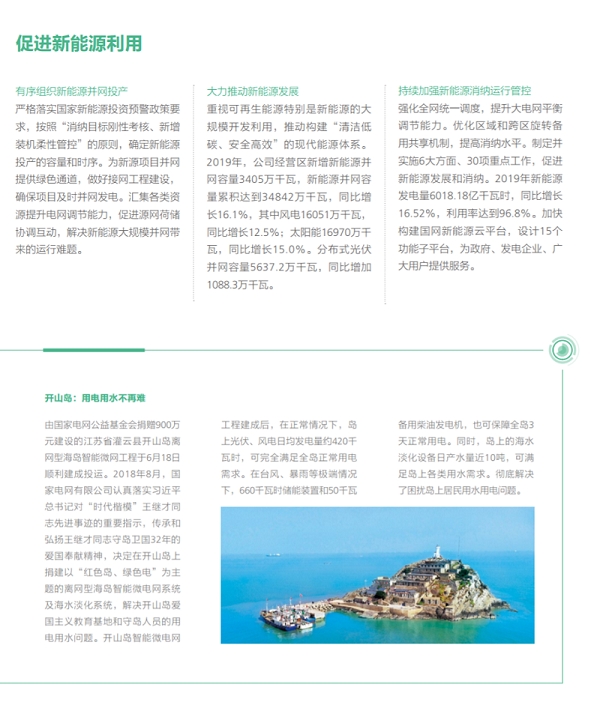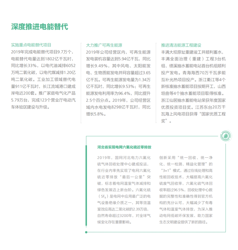 在努力做綠色發展的表率方面,國家電網有限公司認真貫徹落實綠色發展理念,全力推進生態文明建設,推動能源更高質量、更可持續發展,以綠色低碳高效的充足電能,全力服務美麗中國建設。2019年經營區新增新能源并網容量3405萬千瓦,新能源并網容量累積達到34842萬千瓦,同比增長16.1%,新能源云平臺接入新能源場站55萬余座、裝機容量2.3億千瓦,累計交易額754.3億元,帶動產業鏈上下游3000余家企業協同發展;完成電能替代項目9.7萬個,電能替代電量達到1802億千萬時,“煤改電”配套電網建設惠及19684個村、372萬戶居民,以電代油減排二氧化碳6052萬噸,以電代煤減排二氧化碳1.20億噸;智慧車聯網平臺累計接入充電樁43萬個,充電量達14.82 億千瓦時,同比增長73.86%。