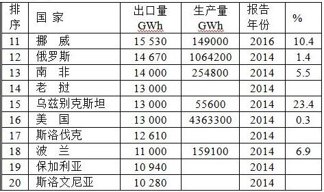 現在又看全球電力出口情況。表中%表示電力輸出量占該國生產量的份額。出口國約有95個國家或地區,請點擊美國中央情報局網站:https://www.cia.gov/library/publications/the-world-factbook/rankorder/2234rank.html