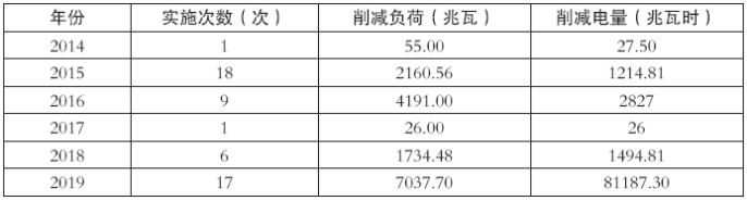 在需求響應實施早期,實施目的主要是為了應對夏季高峰時段電力消費緊張狀況,最大程度削減高峰電力負荷對電網安全的影響,保障了民生用電和重點用電安全平穩。2014~2019年度國內開展削峰需求響應的情況如下表所示。
