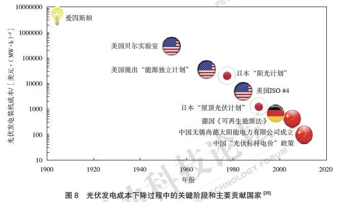 美國能源技術和公共政策學者Gregory F. Nemet于2019年出版著作《光伏如何變得便宜》(How Solar Became Cheap),書中介紹了光伏發(fā)電技術在歷史上的不同發(fā)展階段、成本變化的關鍵驅動因素、關鍵國家對成本降低的貢獻,以及光伏發(fā)電對其他低碳能源技術發(fā)展的經驗模型。光伏發(fā)電的4個關鍵階段為:(1)20世紀50—70年代美國早期實驗室研究,推動每兆瓦時的裝機成本從10萬美元級降到1萬美元級;(2)20世紀90年代的日本“屋頂光伏計劃”,推動每兆瓦時裝機成本降至1000美元級;(3)21世紀初德國《可再生能源法》的發(fā)布實施,推動裝機成本降至1000美元/(MW·h)以下;(4)中國以“光伏標桿電價”等強力政策推動產業(yè)發(fā)展,促進裝機成本降至100美元/(MW·h)以內(圖8)。