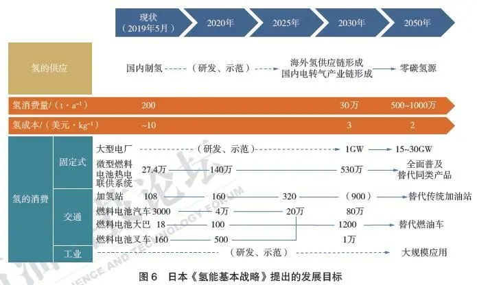 在能源消費方面,2012—2016年,日本能源消費總量減少了6.1%,接近實現(xiàn)2030年節(jié)能目標所需的平均速度。日本能源轉型以氫能規(guī)模化利用為顯著特色和重要抓手,將氫能與電力和熱能并列定位為核心二次能源,并提出建設“氫能社會”的愿景,希望通過氫燃料電池實現(xiàn)氫能在家庭、工業(yè)、交通甚至全社會領域的應用。日本在《氫能基本戰(zhàn)略》提出的主要發(fā)展目標詳見圖6。