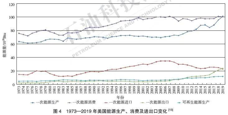 與歐洲的高比例可再生能源、激進的碳減排目標政策不同,美國能源轉型是在實現(xiàn)“能源獨立”的前提下推動能源系統(tǒng)清潔化,以增加清潔能源(包括核電、可再生能源、天然氣和潔凈煤等)應用比例為主要手段。2000年,美國和德國化石能源占一次能源消費總量的比例分別是85%和88. 6%,從這一角度來看兩國能源轉型起點相似;2018年,美國和德國可再生能源在一次能源消費量中所占比例分別為11.4%和16.6%,德國略勝一籌。縱觀1973年以來美國的能源生產、消費和進出口情況,自2005年起,美國可再生能源和核電產量快速增長,清潔能源消費比例加速上升;2010以來,一次能源產量快速增長,并在2019年實現(xiàn)了“能源獨立”(圖4)。