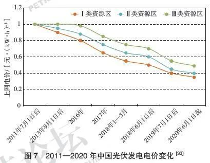 近年來,在全球可再生能源成本迅速下降的過程中,除了政策支持和技術進步以外,產業(yè)規(guī)模經濟和規(guī)模效益是不容忽視的重要推力。中國得益于較為完備的基礎工業(yè)體系和龐大的市場,在推動風電、光伏發(fā)電、生物質發(fā)電、動力電池、氫能利用等產業(yè)發(fā)展過程中,發(fā)揮了巨大的規(guī)模經濟優(yōu)勢。2013年以來,在國家政策的大力支持下,中國光伏發(fā)電產業(yè)不斷擴大規(guī)模,迅速發(fā)展為全球最大的市場,同時也擺脫了困擾光伏產業(yè)多年的“兩頭在外”的尷尬局面。2013—2018年,中國光伏裝機容量達到1.74×108kW,年復合增長率超過73%,較2012年的0.065×108kW增長26 倍。光伏發(fā)電上網電價從2011年的1元/(kW·h),下降到2020年的0.35~0.49 元/(kW·h)(2020年6月1日開始實施)(圖7)。在這一過程中,國內涌現(xiàn)出一批優(yōu)秀的光伏企業(yè),在2019全球光伏企業(yè)20強排行榜上有16家中國公司,前10名中有7家中國公司。