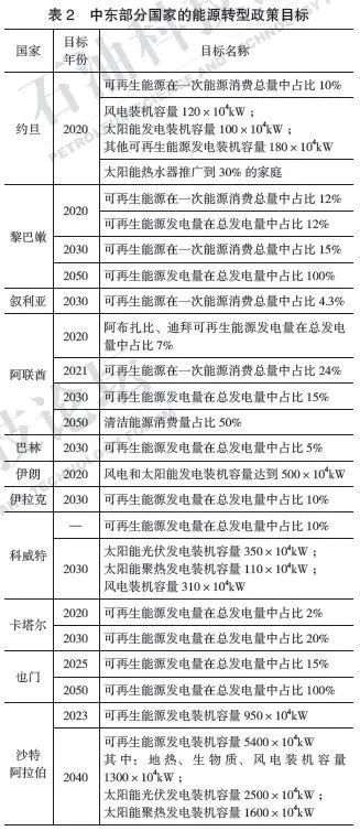 21世紀以來,全球能源格局發(fā)生重大變化,以美國頁巖氣革命為代表的非常規(guī)油氣開采量爆發(fā)式增長,可再生能源產業(yè)高速發(fā)展,全球能源消費中心不斷向發(fā)展中國家轉移。這些因素促使中東國家對后石油時代進行戰(zhàn)略思考。近年來,推進能源轉型、擴大可再生能源應用比例逐步進入政府部門的視野,沙特阿拉伯、阿聯(lián)酋、卡塔爾、科威特等國相繼制定了多項政策目標(表2)。