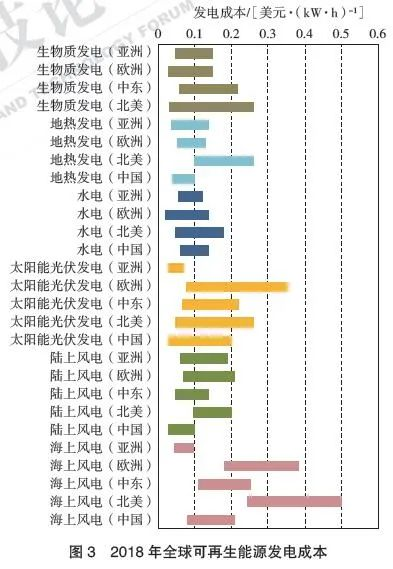 第三,可再生能源大規(guī)模開發(fā)利用。風力發(fā)電和太陽能光伏發(fā)電成為全球成本下降最快、平均成本最低的可再生能源發(fā)電方式。2018年,除海上風電以外,全球各地多種可再生能源發(fā)電技術的成本開始具備較強的成本競爭力(圖3)。在許多國家和地區(qū),可再生能源已開始了對化石能源發(fā)電的存量替代。中國是世界上可再生能源利用規(guī)模最大、平均成本最低的國家,從2014年開始,每年的風電和太陽能發(fā)電量均超過全社會新增用電量。