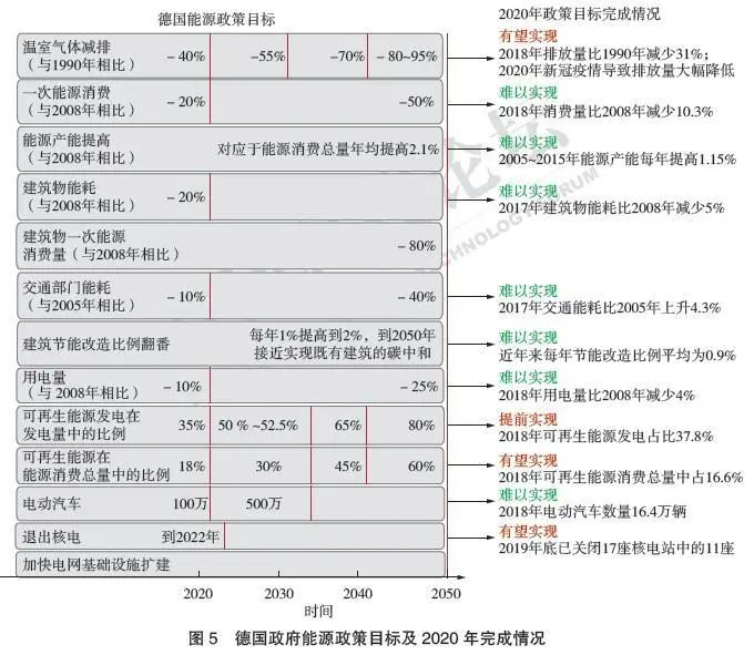 德國能源資源稟賦不佳,除了煤炭儲量相對豐富外,石油和天然氣高度依賴進口。德國能源轉型實踐始于21世紀初,確立了“能源安全、經濟效率和環(huán)境可承受”的能源政策三大目標,核心思想是可持續(xù)發(fā)展。2000年,德國出臺《可再生能源法》,確定了可再生能源發(fā)展的多項激勵措施,并分別在2004年、2009年、2012年、2014年針對實際情況做出修訂和調整。2014年底,德國頒布《國家能效行動計劃》,對能源消費總量、建筑能效和交通能效等提出行動目標。考察2020年之前所完成的半數轉型目標,與其他國家相比,德國是能源轉型的“優(yōu)等生”(圖5)。