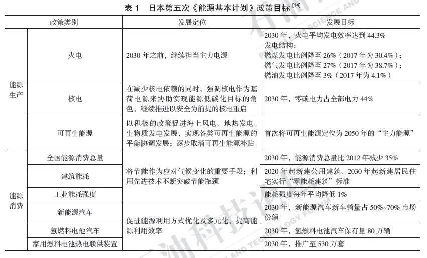 日本能源消費高度依賴進口,能源自給率低于10%,是發(fā)達國家中能源自給率最低的國家之一。日本能源轉型戰(zhàn)略的主要思路不拘泥于能源自給率,著力通過能源技術優(yōu)勢彌補資源稟賦的劣勢,將能源技術能力作為保障能源安全、穩(wěn)定能源供給、優(yōu)化能源結構和提高產業(yè)競爭力的戰(zhàn)略性手段。2018年,日本發(fā)布了第五次《能源基本計劃》,提出了能源轉型戰(zhàn)略的新目標、新路徑和新方向(表1)。