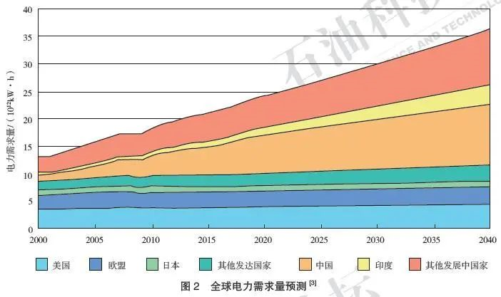 第二,現(xiàn)有能源利用系統(tǒng)變革,電力、氫能等二次能源消費規(guī)模不斷擴大。電力在終端能源消耗中所占的比例已從2000年的16%,增長到2018年的20%。國際可再生能源署(IRENA)認為,全球電力需求量將持續(xù)高速增長,2050年,電力在終端能源消費中所占比例將提高到49%左右。國際能源署認為,全球電力需求的增長在發(fā)達國家和發(fā)展中國家將表現(xiàn)出兩條截然不同的路徑:在發(fā)達國家,電力需求增長將被數字化和電氣化技術進步帶來的能效全面提升所抵消;在發(fā)展中國家,家庭收入的增長、工業(yè)規(guī)模的擴大和服務業(yè)的發(fā)展正在有力地推動電力需求增長,按照既定政策,預計2019—2040年,發(fā)展中國家對全球電力需求增長的貢獻接近90%(圖2)。