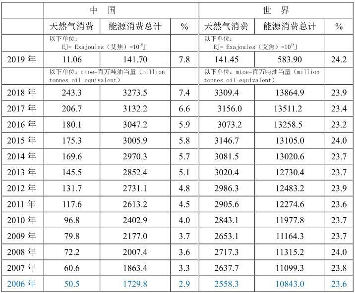 天然氣消費量是指本國天然氣產量和進口量之和。中國于2006年開始LNG國際貿易,2010年管輸國際貿易開始,因此從下表可以看出,2006年中國天然氣剛開始進口,消費量僅占世界天然氣消費總量的2.1%,但隨著LNG和管輸國際貿易以來,中國天然氣消費量僅占世界天然氣消費總量的比例(%)逐年增加,到2019年中國天然氣消費占世界消費總量的比例已經達到7.8%。