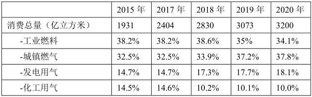 天然氣消費結構是指天然氣利用的鄰域。天然氣作為工業燃料和城鎮燃氣,在中國一直占據重要地位,特別是城鎮民用燃料呈現逐年上升的趨勢。中國的燃氣發電在全球居第三位,用氣量也呈現快速上升。中國是一個農業生產大國,因此化肥生產一直占據重要地位,近年約有下降但產量卻上升。