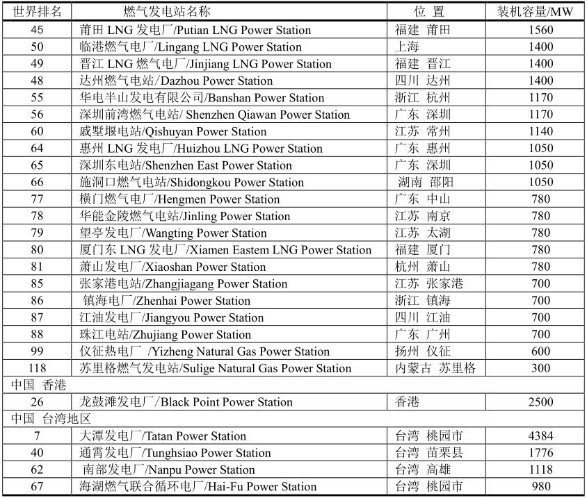 中國最大的燃氣發電站在中國臺灣地區—大潭發電廠(Tatan Power Station),其次是香港—龍鼓灘發電廠(Black Point Power Station)。