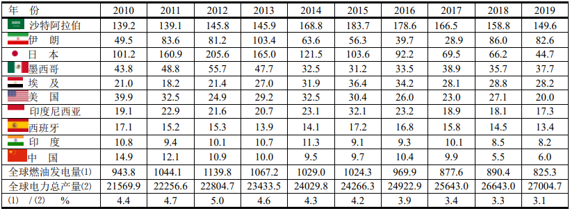 燃油發電在化石燃料發電份額中不占重要地位,比燃煤發電和燃氣發電都低得多,而且多數國家逐步在降低。2019年僅占全球發電總量的825.3/27005=3.1%。燃油發電最多的國家是產油大國沙特阿拉伯,占燃油發電總量的149.6/825.3= 18.1%,其次是伊朗,占82.6/825.3= 10.0%。