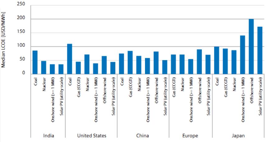 在中國和印度,風(fēng)電和光伏等間歇性可再生能源的平均平準化發(fā)電成本最低,兩國的公用事業(yè)規(guī)模的太陽能光伏發(fā)電和陸上風(fēng)電成本最低。核電也具有競爭力,這表明兩國都擁有從當(dāng)前仍然高度碳密集的發(fā)電中轉(zhuǎn)型到低碳發(fā)電的基礎(chǔ)。