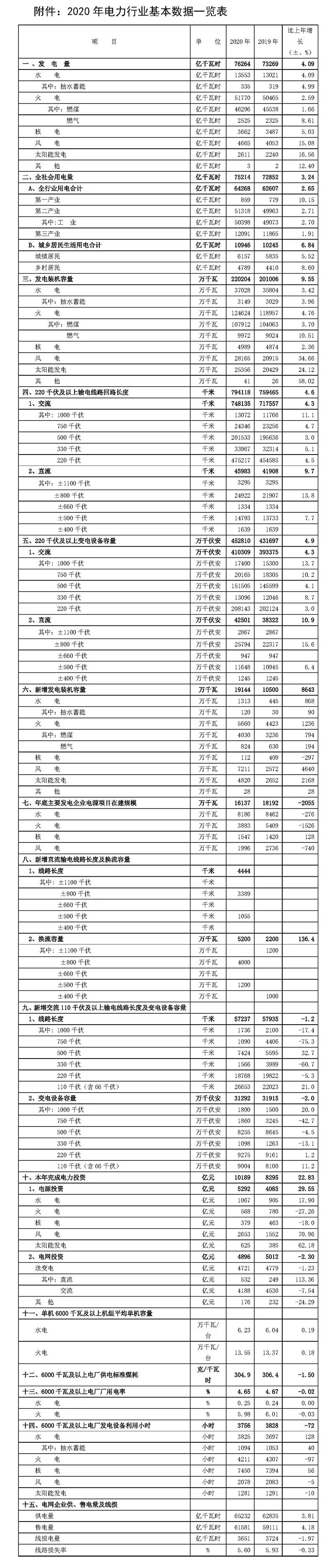2020年,全國全口徑發電量為76264億千瓦時,比上年增長4.1%,增速比上年下降0.7個百分點。其中,水電13553億千瓦時,比上年增長4.1 %(抽水蓄能335億千瓦時,比上年增長5.0 %);火電51770億千瓦時,比上年增長2.6%(煤電46296億千瓦時,比上年增長1.7%;天然氣2525億千瓦時,比上年增長8.6%);核電3662億千瓦時,比上年增長5.0%;并網風電4665億千瓦時,比上年增長15.1%;并網太陽能發電2611億千瓦時,比上年增長16.6%。