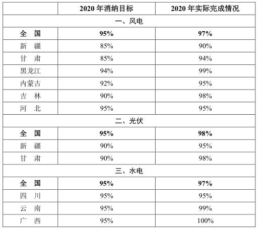 根據2018年國家發展改革委、國家能源局印發的《清潔能源消納行動計劃(2018-2020年)》(發改能源規〔2018〕1575號),所確定的分年度風電、光伏和水電消納目標,2020年全國平均風電利用率97%,超過2020年風電利用率目標2個百分點,重點省區全部達到了2020年消納目標;全國平均光伏發電利用率為98%,超過2020年利用率目標3個百分點,重點省區全部達到了2020年消納目標;全國主要流域水能利用率97%,超過2020年利用率目標近2個百分點,重點省區全部達到了2020年消納目標。
