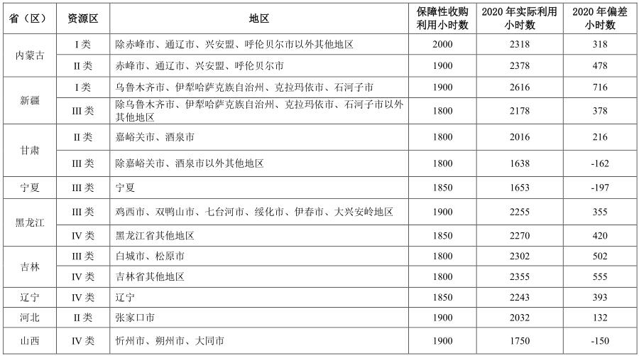 表3 2020年風電重點地區最低保障收購年利用小時數落實情況