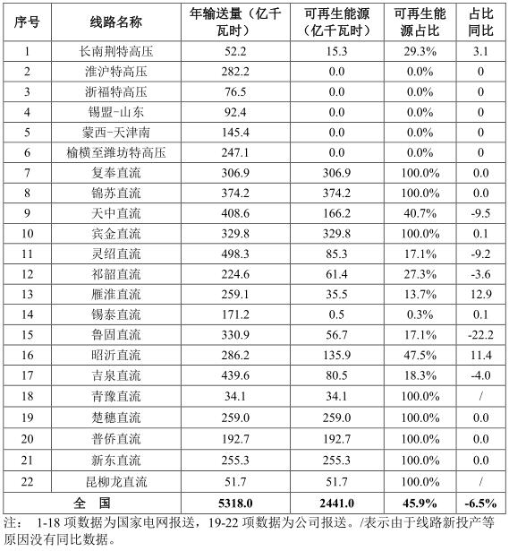 2020年,22條特高壓線路年輸送電量5318億千瓦時,其中可再生能源電量2441億千瓦時,同比提高3.8%,可再生能源電量占全部輸送電量的45.9%。國家電網運營的18條特高壓線路輸送電量4559億千瓦時,其中可再生能源電量1682億千瓦時,占輸送電量的37%;南方電網運營的4條特高壓線路輸送電量759億千瓦時,全部為可再生能源電量。