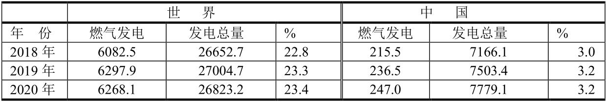 世界與中國燃?xì)獍l(fā)電的比較(單位:TWh)