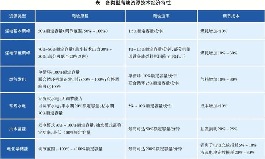 系統(tǒng)爬坡能力需基于各類型爬坡資源技術(shù)經(jīng)濟特性開展分析。從爬坡速率和里程等調(diào)節(jié)性能看,電化學(xué)儲能和抽水蓄能普遍優(yōu)于煤電、氣電等火電電源,可調(diào)節(jié)水電枯水期的調(diào)節(jié)能力優(yōu)于豐水期;從調(diào)節(jié)成本看,煤電基本調(diào)峰和常規(guī)水電調(diào)節(jié)成本較低,氣電調(diào)峰次之,抽水蓄能與電化學(xué)儲能的成本取決于抽發(fā)電價差與轉(zhuǎn)換效率,煤電深度調(diào)峰成本較高。