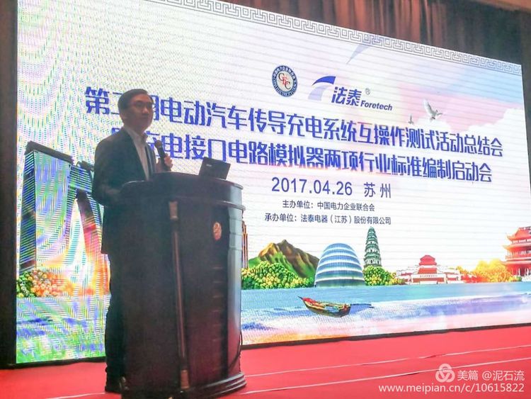 2017年4月26日,第二期電動汽車傳導充電系統互操作性測試活動總結會在蘇州召開,本次會議由中國電力企業聯合會標準化管理中心、能源行業電動汽車充電設施標準化技術委員會充電檢測認證標準工作組、中國電動汽車充電基礎設施促進聯盟標準實施促進專業委員會聯合主辦,來自全國電動汽車行業、充電設施行業、電動汽車及充電設施檢測機構及相關企業代表共150多人參加了會議。